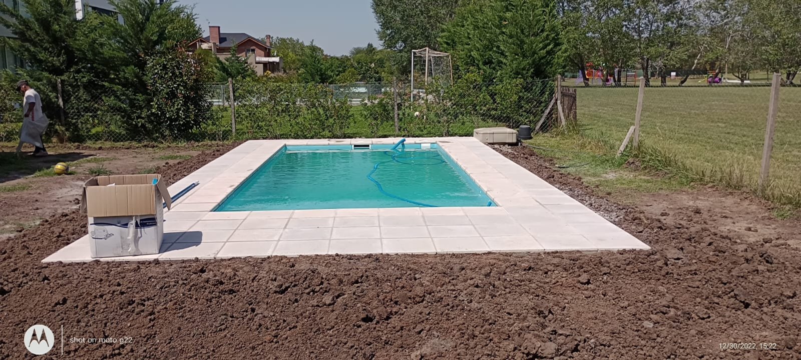 Instalación completa de piscina rectangular con borde atérmico y sistema de filtrado automático. Incluyó nivelación de terreno.